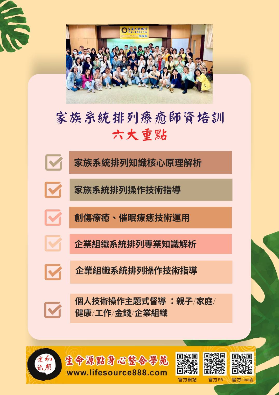 家族系統排列師資的養成,需要有多年現場工作經驗的導師來帶領,導師的專業及不同領域的服務經驗,能提供學員們學習到,在面對不同的群眾時能有多元的專業技術服務。另外提供各種不同單位的實習,也讓學員們開啟對生命服務不同的視野,提升學習系統排列專業操作能力的深度及廣度。
