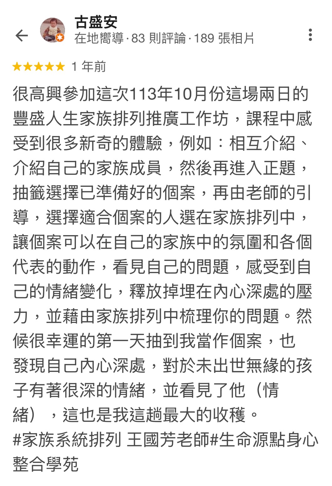 以下是來自生命源點家族系統排列學員,在王國芳老師親自帶領,課後的真實經驗與內在轉化學習分享